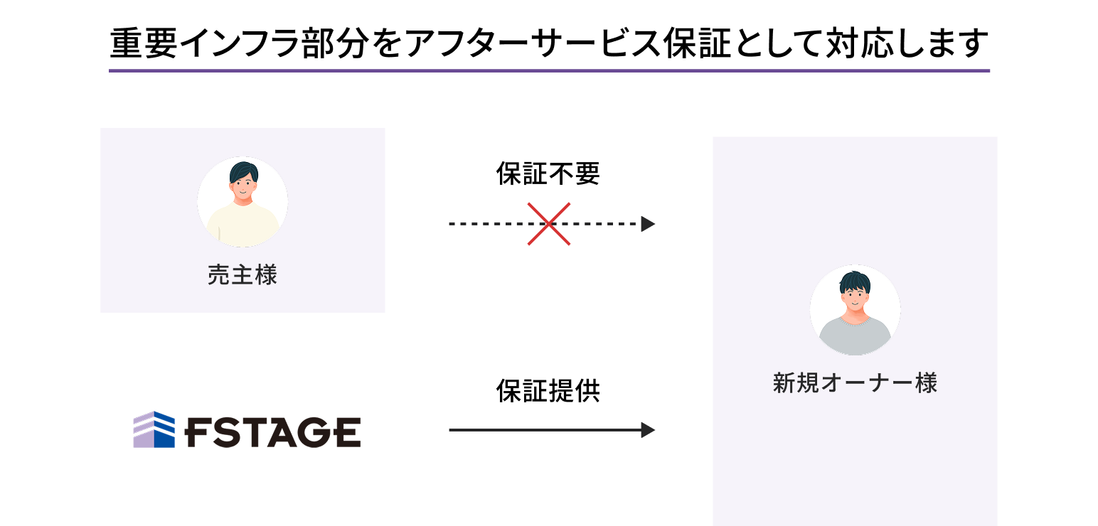 購入者様に安心してご購入いただけるよう、重要インフラを対象とした2年間のアフターサービス保証をご用意しています。通常オーナー様のご負担となることの多い引渡し後の保証責任のうち、特に負担の大きい重要インフラ部分に関して、当社のアフターサービス保証による対応が可能となり、ご売却後の負担やリスクを軽減し、より安心な売却を実現します。